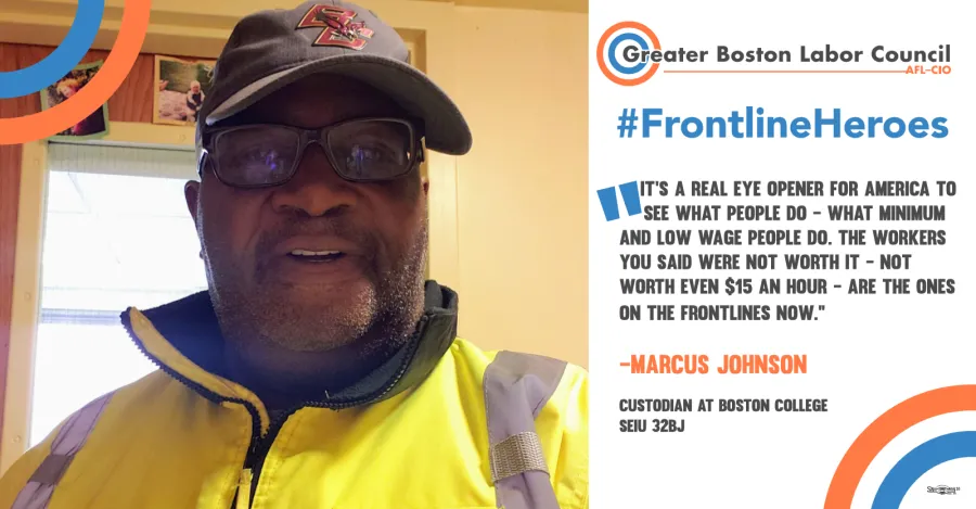 Marcus Johnson is a custodian at BC and member of 32BJ SEIU who has been reporting to work throughout the coronavirus crisis. Marus shares his story with us as part of the Greater Boston Labor Council's #FrontlineHeroes series. Our series profiles the work of union members and everyday heroes who are working on the frontlines during the global pandemic. Stories are updated weekly. To read other Frontline Hero stories, click here: https://gblc.us/tag/frontline-heroes.